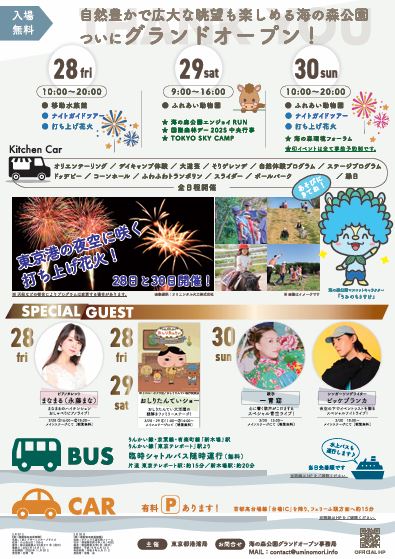 | お問い合わせ先 | 海の森公園グランドオープン事務局 contact@uminomori.info |