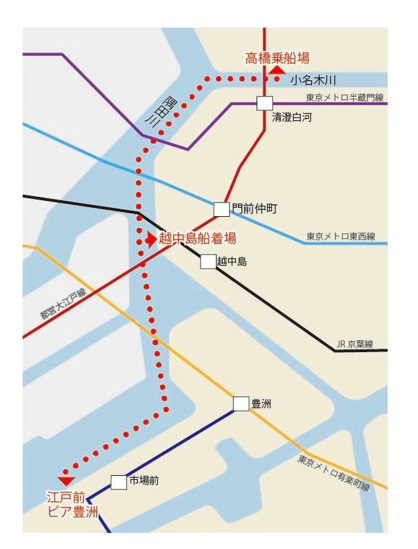 | 高橋乗船場【10:30発】 ↓↓ 越中島船着場【11:00発】 ↓↓ 千客万来乗船場「江戸前ピア豊洲」【11:15着】 | 千客万来乗船場「江戸前ピア豊洲」【14:00発】 ↓↓ 越中島船着場【14:30発】 ↓↓ 高橋乗船場【14:45着】 |