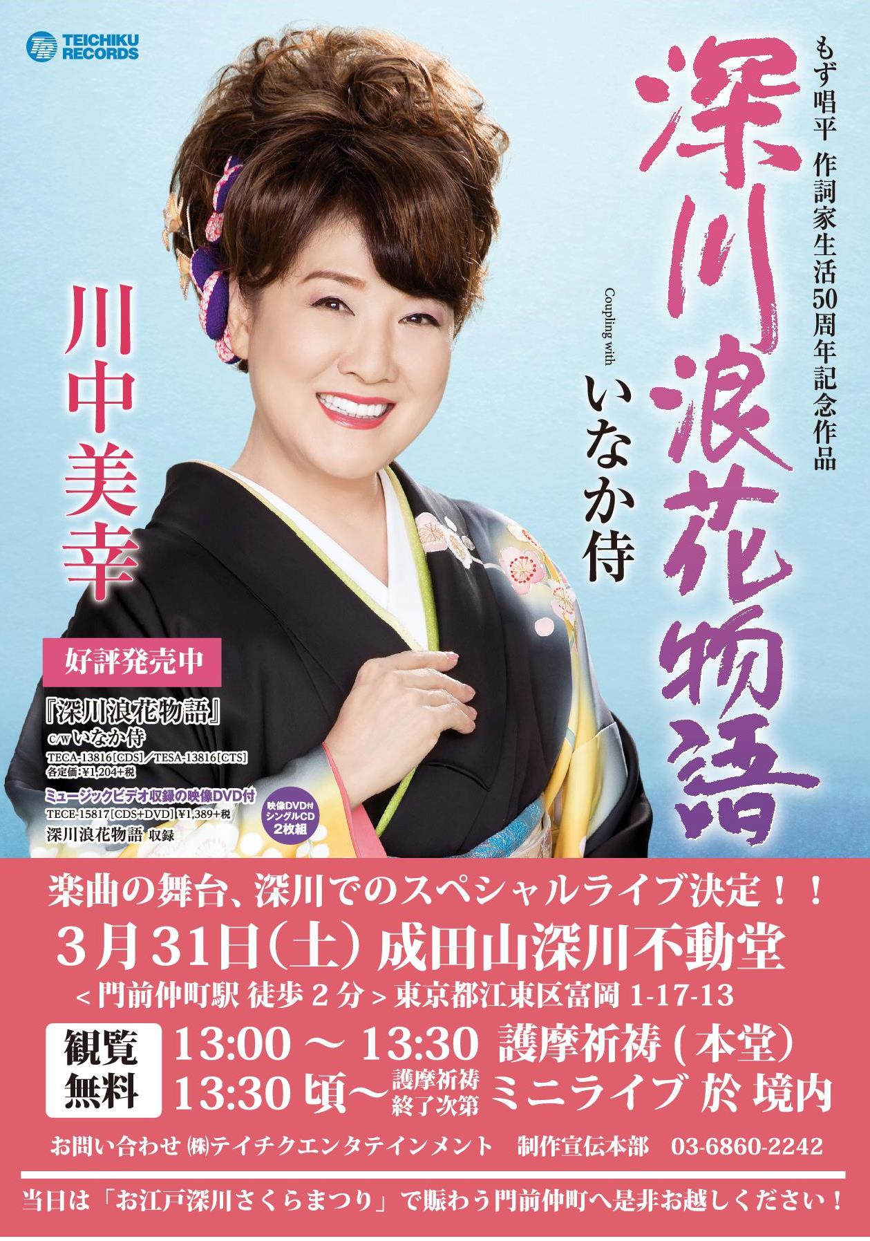 3月31日(土)深川不動堂にて、川中美幸さんによるスペシャルミニライブが決定しました!ここ深川を舞台に、『深川浪花物語』を披露していただきます。