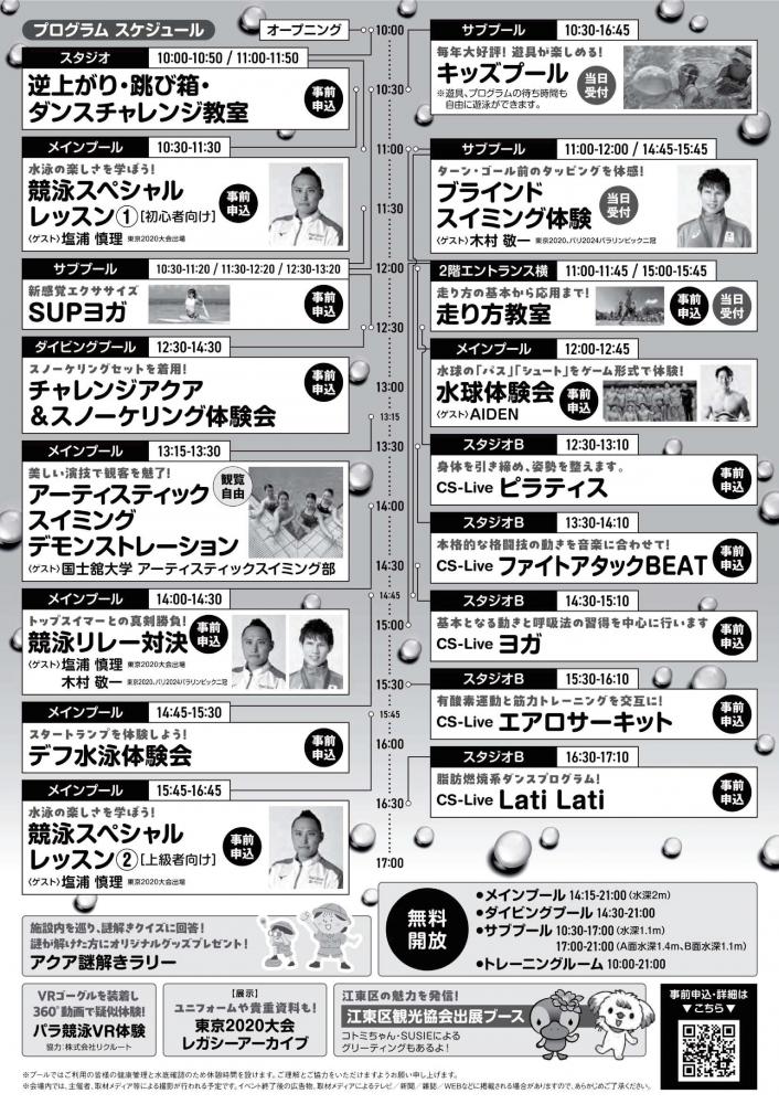 今年は、スペシャルゲストとして、東京2020大会出場・塩浦慎理さん、パラリンピック金メダリスト・木村敬一さん、元水球日本代表・荒井陸さんをお迎えし、オリンピアンによるスペシャルレッスンや競泳リレー対決、水球体験会など、参加者の皆さまと一緒に楽しめる多彩な体験プログラムをご用意しています。