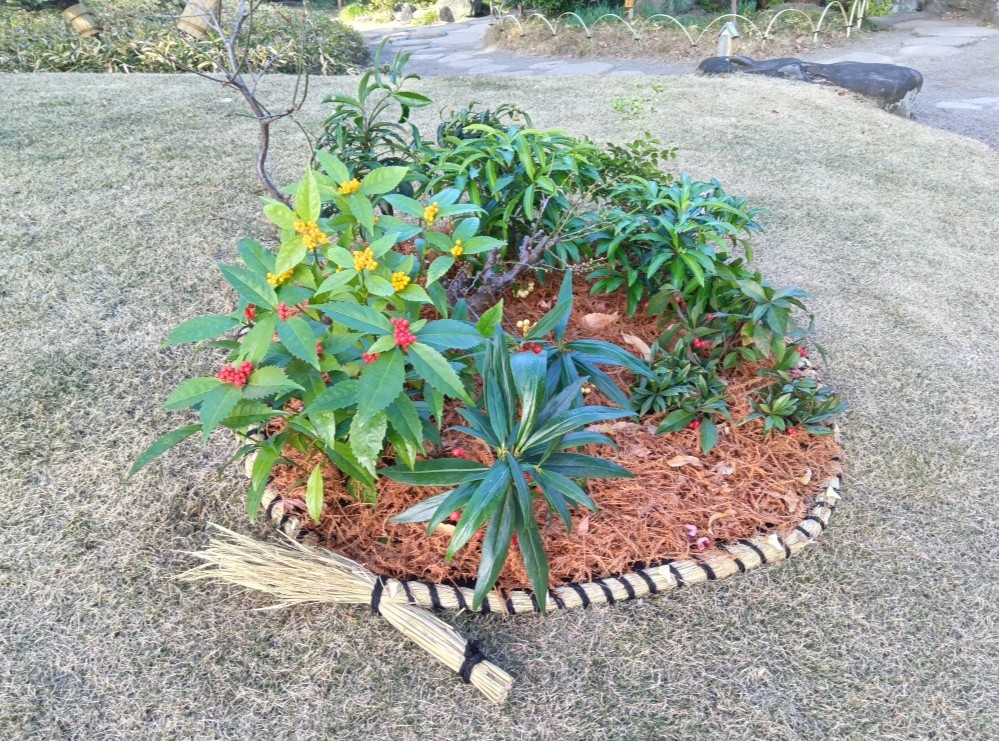新春の縁起物である松竹梅の寄せ植えを展示します。