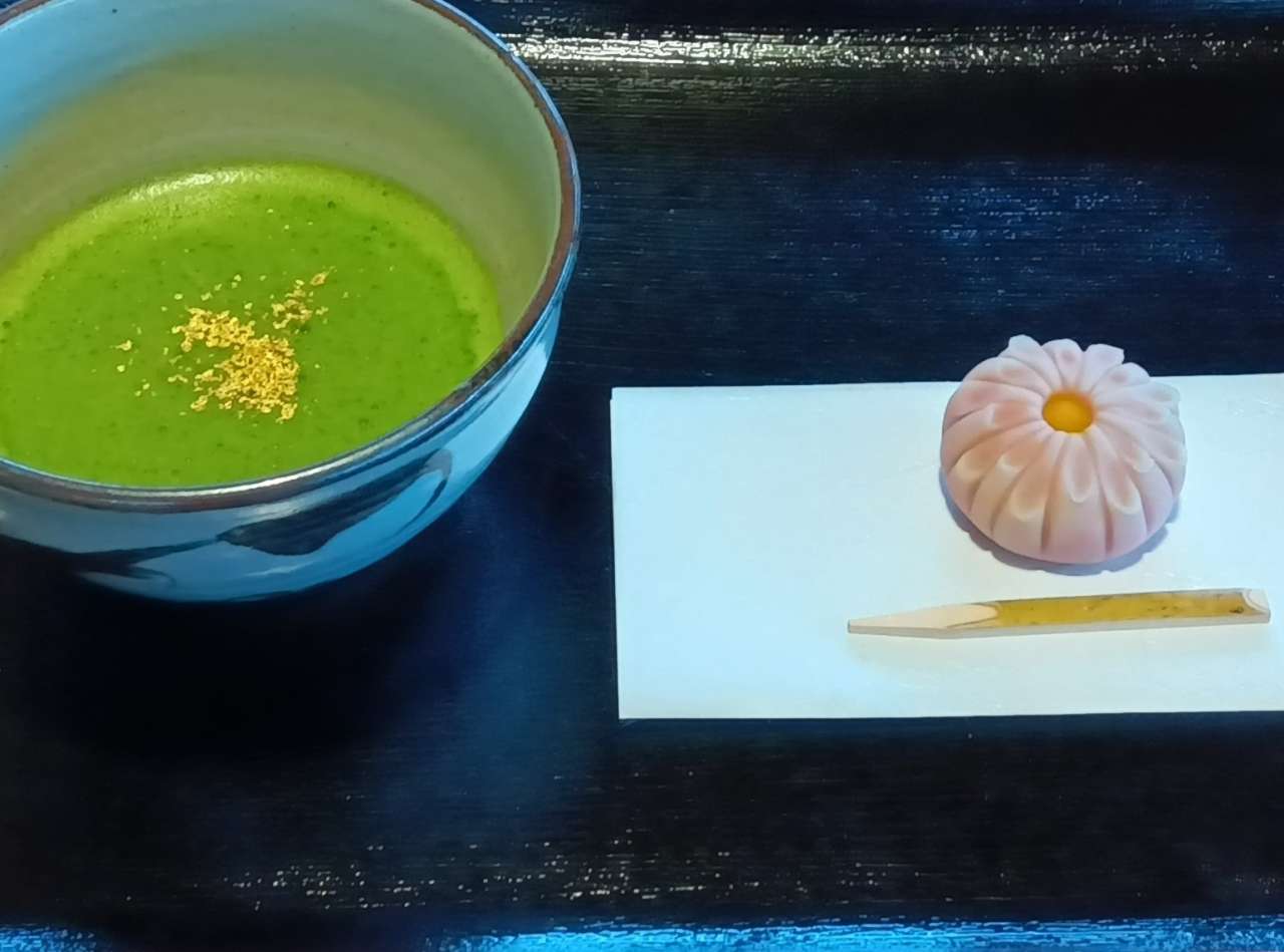 金粉抹茶と上生菓子のセット等の販売を行います。目の前に広がる庭園を楽しみながらお抹茶などをお召し上がりください。