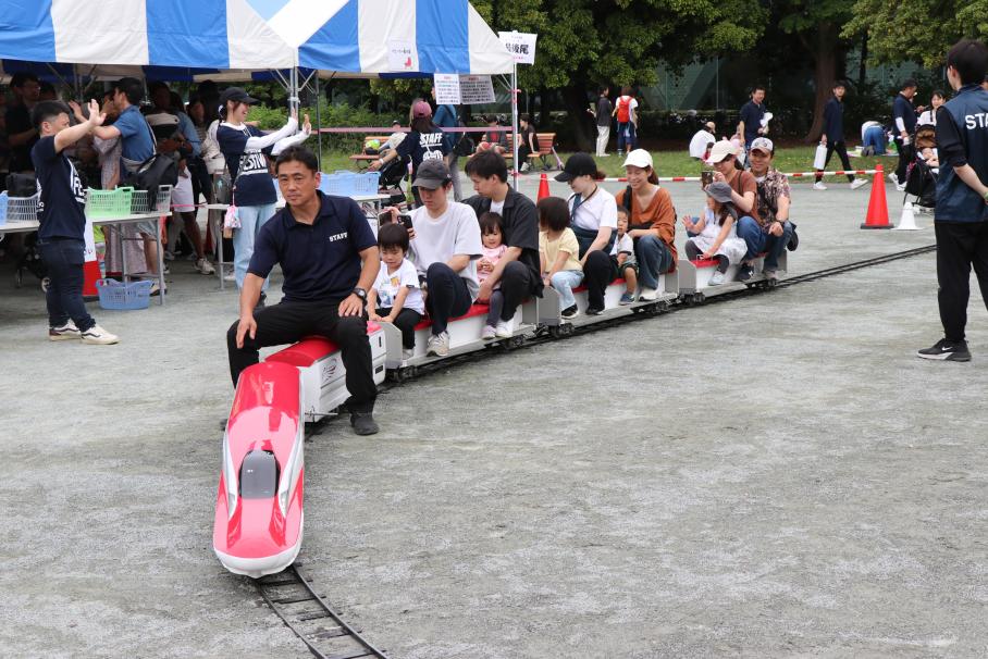 あそびひろばでは、ミニ列車やふわふわのアトラクションのほか飲料販売、児童館・協力団体・区民参加団体によるブースがあります。