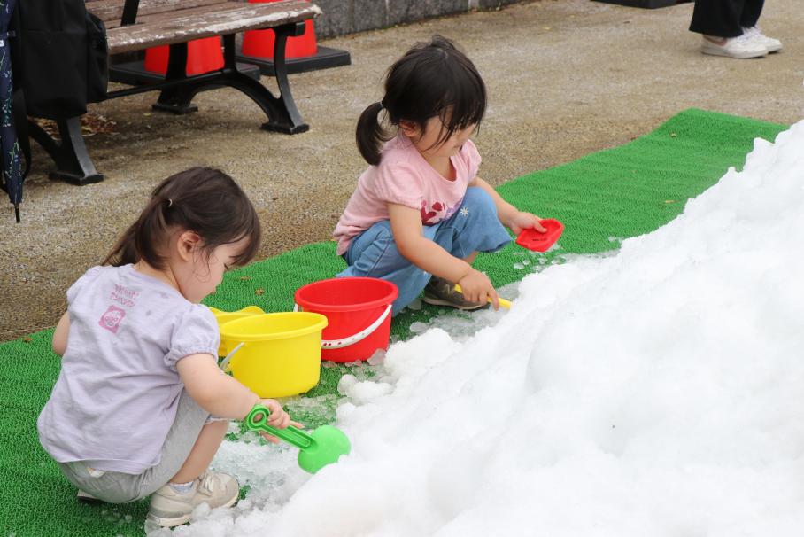 岩手県北上市から運んだ雪で遊べるコーナーです。5月の暑い中、ひんやり気分をちょっと味わえる人気のコーナーです。