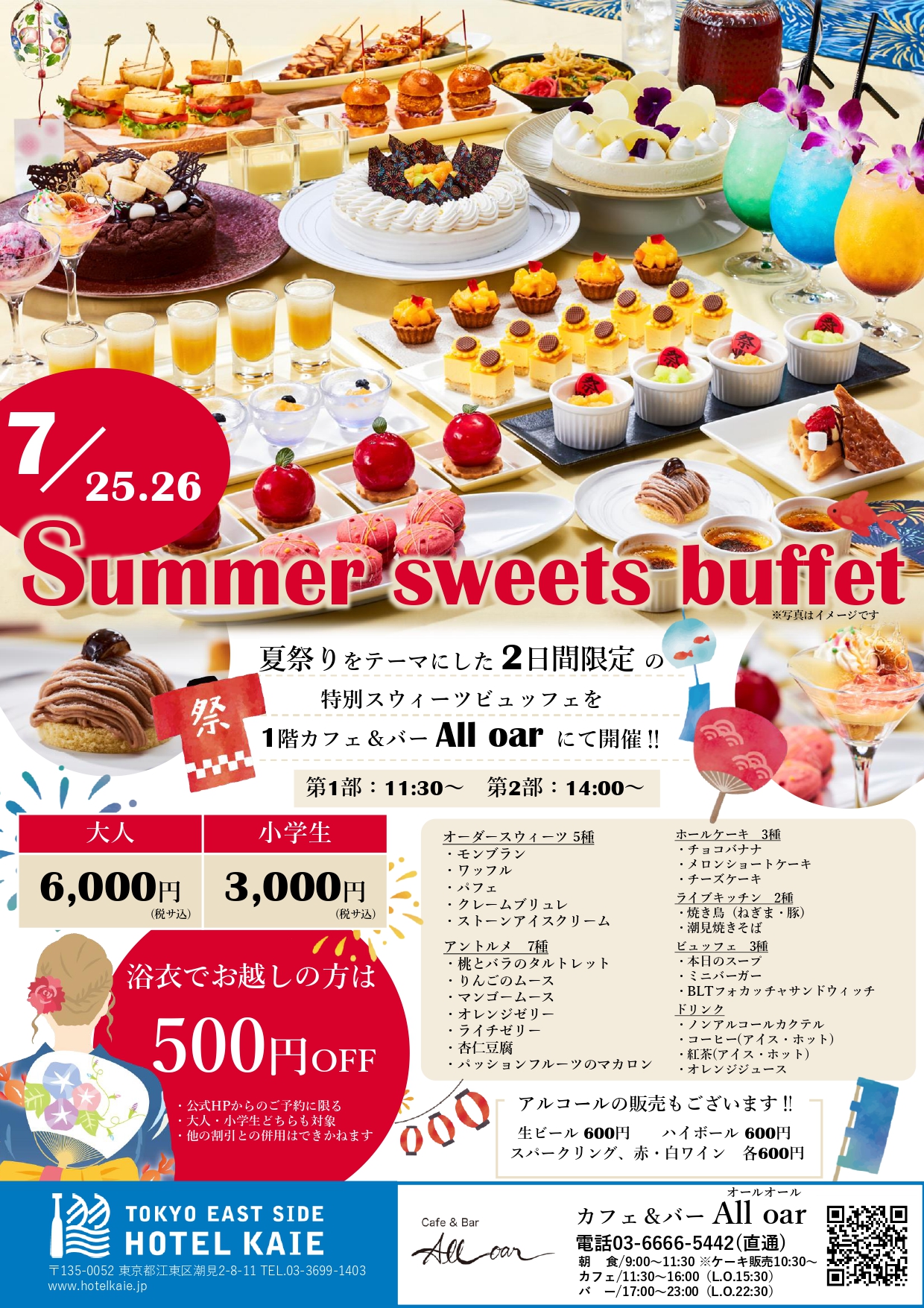 ホテル櫂会 カフェ&バー All oarでは、2025年7月25日(金)・26日(土)の2日間限定で、夏の特別イベント【Summer Sweets Buffet】を開催します。
