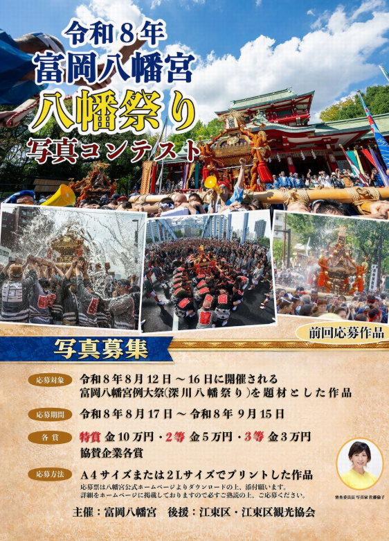 令和8年富岡八幡宮 八幡祭り写真コンテストを開催。8月12日(水)~16日(日)に開催される富岡⼋幡宮例祭(深川⼋幡祭り本祭)を題材とした作品を募集します。