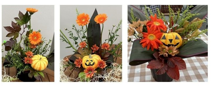 ハロウィンらしい色味のお花やグリーンを使って、フラワーアレンジメントを作ります。