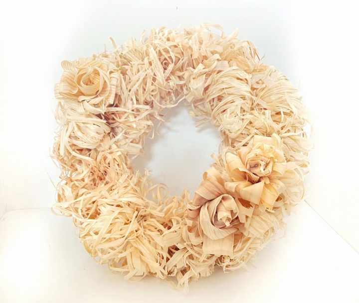 新木場の木材会社さんのかんなくずでリースをつくります。家に帰ってから、お気に入りのリボンやオーナメントを飾るとオリジナルデザインのリースが完成です。