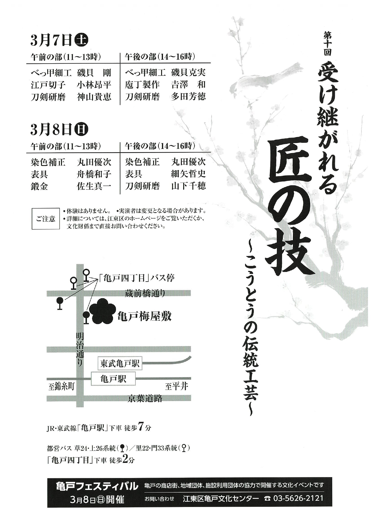 | 備考 | ●体験はありません。 ●実演者は変更となる場合があります。 ●詳細については、江東区のホームページをご覧いただくか、文化財係まで直接お問い合わせください。 |