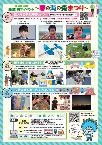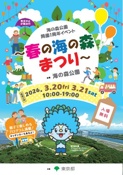 海の森公園は、3月に開園1周年を迎えます。開園1周年を記念し、自然豊かで広大な海の森公園の魅力を体感できる「春の海の森まつり」を開催します。日頃から公園の森づくりに携わっている海の森子どもレンジャーやボランティア、企業の皆様と協力して、自然との触れ合いやご家族で楽しめるコンテンツが盛り沢山の内容となっています。縁日やお絵描きランタンなど特別な時間をお楽しみいただけます。この機会に海の森公園にお越しください。